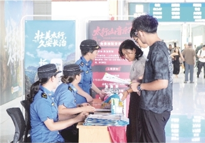 为迎接全国乐迷朋友参加2025太行山音乐节,市城市管理综合行政执法队高铁女子中队在高铁长治东站开展志愿服务活动为旅客介绍我市的风土人情、旅游景点、地方小吃,同时,还准备了矿泉水、防暑药品、小礼品等,通过热情周到的服务,向全国展示美丽、好客的长治形象。 本报记者 牛红岩 摄