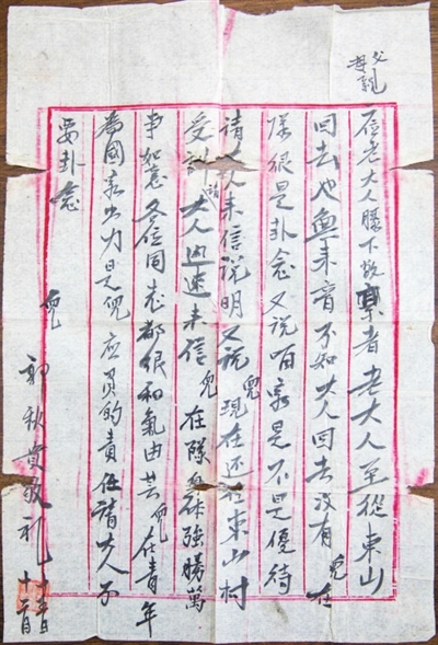 “二位老大人自从东山回去也未来音,不知大人回去没有,儿在队里很是挂念……儿在青年,为国家出力是儿应负的责任,请大人不要挂念……”