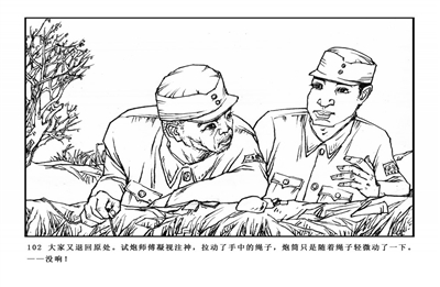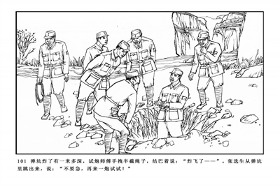 101.弹坑炸了有一米多深,试炮师傅手拽半截绳子,结巴着说:“炸飞了——”张选生从弹坑里跳出来,说:“不要急,再来一炮试试。”