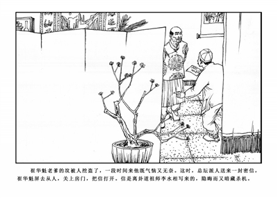 111.崔华魁老爹的坟被人挖盗了,一段时间来他既气恼又无奈。这时,总坛派人送来一封密信,崔华魁屏去众人,关上房门,把信打开。信是离卦道祖师李水相写来的,隐晦而又暗藏杀机。