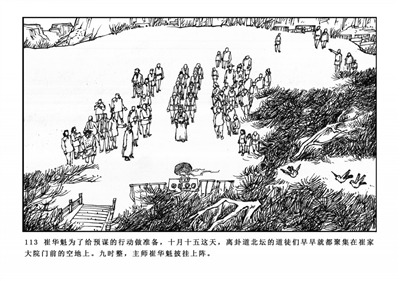 113.崔华魁为了给预谋的行动做准备,十月十五这天,离卦道北坛的道徒们早早就聚集在崔家大院门前的空地上。九时整,主帅崔华魁披挂上阵。