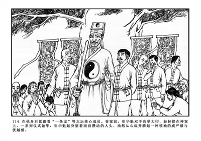 114.在他身后紧跟着“一条龙”等北坛核心成员。香案前,崔华魁双手高举大印,轻轻供在神案上。一系列仪式做罢,崔华魁起身望着面前攒动的人头,从心底升腾起一种威严感与优越感。