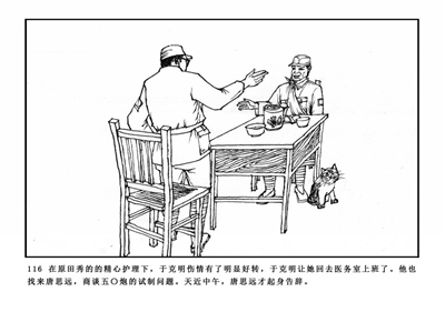 116.在原田秀的精心护理下,于克明伤情有了明显好转。于克明找来唐思远,商谈五○炮的试制问题。临近中午,唐思远才起身告辞。