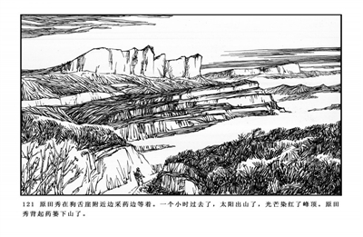 121.原田秀在狗舌崖附近边采药边等待。一个小时过去了,太阳出山了,光芒染红了峰顶,原田秀背起药篓下山了。