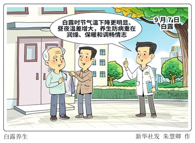 7日将迎来秋季的第三个节气“白露”。中医专家介绍,白露时节气温下降更明显、昼夜温差增大,容易诱发呼吸系统、心血管、皮肤和关节等方面的疾病,养生防病重在润燥、保暖和调畅情志。