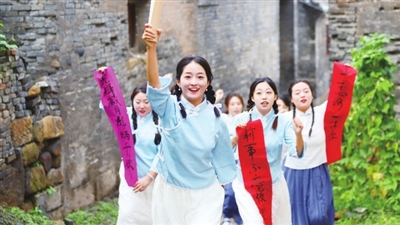 9月3日,该体验区迎来首演,近百名古镇保护志愿者担任“历史见证者”,以饱满的情绪和激昂的口号,生动再现1945年抗战胜利消息传至荫城时,社会各界群众欢庆胜利的感人场景。现场有振臂高呼的“学生”、昂首挺胸的“军人”,更有敲锣打鼓、喜迎胜利的群众。舞狮队伍将气氛推向高潮,大家欢呼雀跃庆祝胜利。整场演出极具感染力,使观众深切感受到胜利来之不易,也让荫城厚重的历史与抗战的记忆变得可触可感。