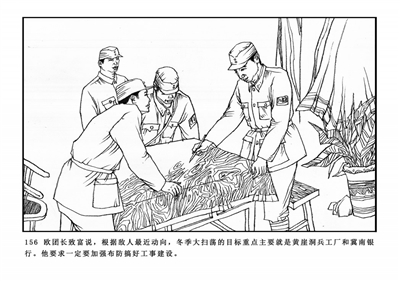 156.欧致富团长说,根据敌人最近动向,冬季大扫荡的目标重点是黄崖洞兵工厂和冀南银行。他要求一定要加强布防,搞好工事建设。
