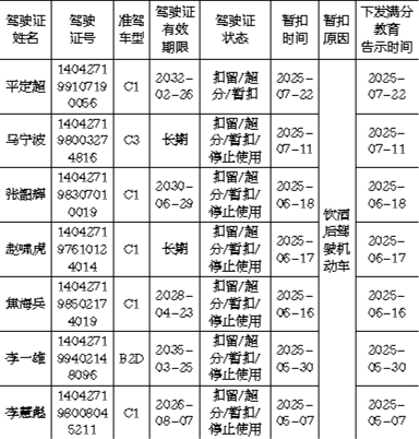 以下7名机动车驾驶人在一个记分周期内累积记分满12分,收到满分教育通知书后三十日内拒不参加公安机关交通管理部门通知的满分学习、考试或经考试仍不合格的,根据《中华人民共和国道路交通安全法实施条例》第二十三条、第二十五条和《道路交通安全违法行为记分管理办法》(公安部163号令)第二十九条之规定,自本公告发布之日起,壶关县公安局交通警察大队将公告其机动车驾驶证停止使用。