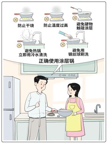 正确使用涂层锅,消费者需要注意以下情况:一是防止干烧。空锅加热会使温度在短时间内快速上升,而每种涂层都有使用温度上限。二是防止温度过高。放油之后不要等冒油烟再放菜,过高温度会损害涂层。三是避免硬物触碰涂层。选用耐热的硅胶铲或木铲,避免使用金属铲,不烹制硬骨头、贝壳类、螃蟹类坚硬食材,防止刮伤涂层。四是避免热锅立即用冷水清洗。烹饪完成后,刚炒完菜的锅还处于高温膨胀状态,若立即加入冷水,热胀冷缩易导致变形或损坏。五是避免用钢丝球刷洗。清洗锅时,选用柔软的海绵或抹布清洗,防止破坏涂层。