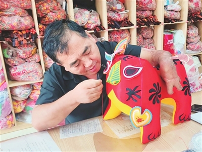 在黎城县乔老憨家纺棉制品有限公司里,乔艳波正俯身于工作台前,为一只黎侯虎缝制纹样。针线在他指间稳稳穿梭,布料上逐渐显现出虎形轮廓。