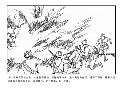 198.欧致富团长会意,火速传令四连,后撤夹沟山头。进入夹沟的日寇,在四连二排和八连居高临下的前后夹击下,全部血肉横飞,无一生还。
