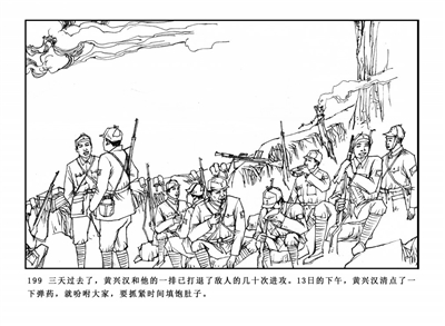 199.三天过去了,黄兴汉和他的一排已打退了敌人几十次进攻。13日下午,黄兴汉清点了一下弹药,随后吩咐大家,要抓紧时间填饱肚子。
