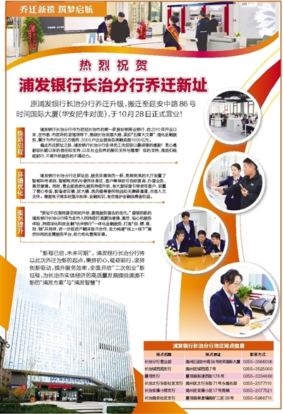 原浦发银行长治分行乔迁升级,搬迁至延安中路86号时间国际大厦(华安肥牛对面),于10月28日正式营业!