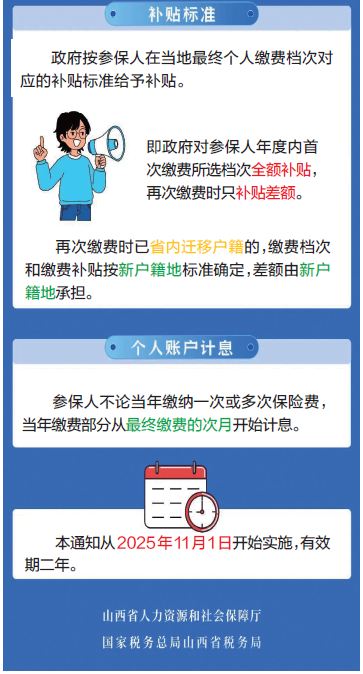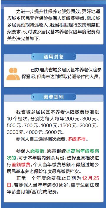 日前,省人社厅、省税务局、省财政厅联合印发《关于完善城乡居民基本养老保险年度缴费有关办法的通知》,旨在为广大参保居民提供更灵活、更贴心的缴费服务,进一步强化“多缴多得、长缴多得”激励机制。经办新规于2025年11月1日起正式实施。