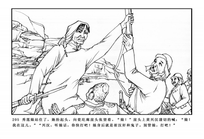 205.秀莲娘站住,她抬起头,向瓮圪廊崖头张望着。“娘!”崖头上黄兴汉凄切地喊:“娘!我在这儿。”“兴汉,听娘话,你快打吧!娘身后就是崔汉奸和鬼子。别管娘,打吧!”