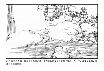 207.崖下的人们向前走着,跟在后边的鬼子突然“哗啦”一下改变了队形,快速向石栈道冲来。