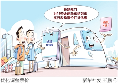 新华社电 (记者樊曦)记者11月7日从国铁集团客运中心和相关铁路局集团公司获悉,铁路部门结合淡季客流特点,优化调整部分动车组列车票价,近期对130余条线路的1300余趟动车组列车票价加大打折优惠力度,最低实行4折优惠。