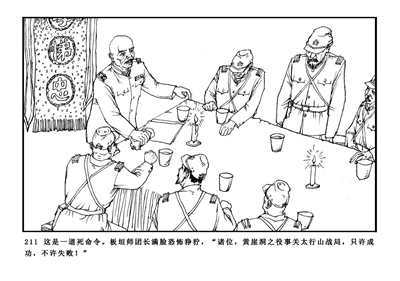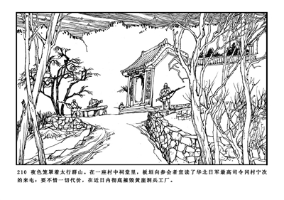 210.夜色笼罩着太行山。在一座村中祠堂里,板垣向参会者宣读了华北日军最高司令冈村宁次的来电:要不惜一切代价,在近日内彻底摧毁黄崖洞兵工厂。