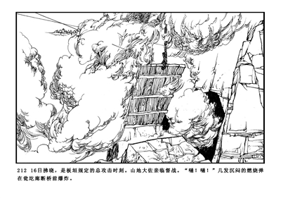 212.16日拂晓,是板垣规定的总攻击时刻。山地大佐亲临督战。“嗵!嗵!”几发沉闷的燃烧弹在瓮圪廊断桥前爆炸。
