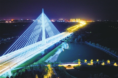 神农湖大桥无疑是夜色中的点睛之笔。桥身两侧的LED灯带次第点亮,暖黄与浅蓝的光线沿着桥梁弧线延伸,宛如一条流光溢彩的丝带横跨浊漳河。灯光倒映在平静的湖面,与岸边绿植的剪影交织,微风拂过,波光粼粼的湖面将桥影揉碎,形成“灯在水中游,人在画中走”的绝美意境。