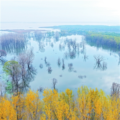 初冬的漳泽湖国家城市湿地公园,湖水澄澈如镜,倒映疏林残枝,岸边树叶鎏金溢彩。水树相依、云影徘徊间,静谧与绚烂交织,尽显北国水乡的温婉诗意,恰似一幅天然水墨丹青。