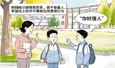 前不久,重庆一名初中老师在社交平台上发布抵制网络烂梗进校园的视频,引发广泛关注。这位教师在视频中称,班上有学生用“唐人”“你好唐人”等网络烂梗嘲笑同学,这种行为实在不妥,很不尊重人,希望班上同学不要再出现类似行为。