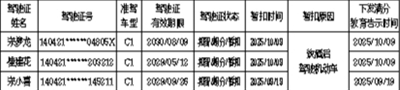 以下3名机动车驾驶人在一个记分周期内累积记分满12分,收到满分教育通知书后三十日内拒不参加公安机关交通管理部门通知的满分学习、考试或经考试仍不合格的,根据《中华人民共和国道路交通安全法实施条例》第二十三条、第二十五条和《道路交通安全违法行为记分管理办法》(公安部163号令)第二十九条之规定,自本公告发布之日起,长治市公安局交通管理支队上党大队将公告其机动车驾驶证停止使用。