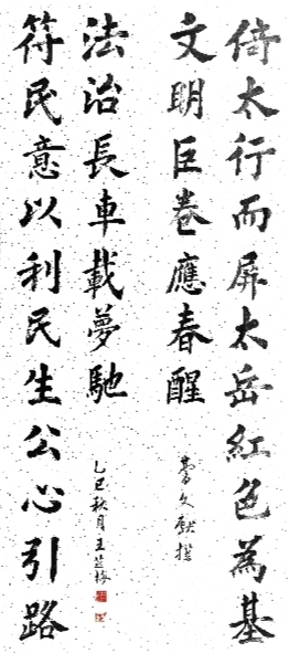 上联描写的是太行山,是革命根据地,举红旗,擂战鼓,这里谱写出一部惊天动地的壮丽史诗。下联描写的是法治社会,为天下营造太平,给人间增添福祉,功德千秋,永葆昌宁。联中的“尊玉律,振金声”,是指法治社会特有的精神风貌。