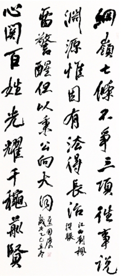 纲领七条,不争三项,往事说渊源,惟因有法得长治; 心关百姓,光耀千秋,前贤留警醒,但以秉公向大同。