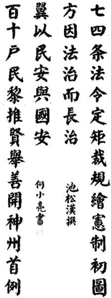 七四条法令,定矩裁规,绘宪制初图,方因法治而长治; 百十户民黎,推贤举善,开神州首例,冀以民安与国安。