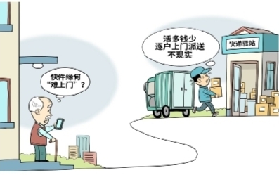 “我们这边只有少数快递公司会送件上门,其他快递公司都把快件放驿站。”湖南邵阳的姜先生说,“驿站离小区还有一段距离,我跟老伴都七十多岁了,家里又没有年轻人,拿快件经常累得气喘吁吁。”