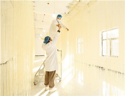 初冬时节,山西天下襄农业科技开发有限公司的生产车间内,一派热火朝天的忙碌景象。工人们正有条不紊地赶订单,从和面、搓条、盘条、绕条上辊、拉条到上架晾晒,一道道工序紧密衔接。丝丝挂面如银瀑般垂挂在架子上,散发着浓郁麦香,成为这里一道独特的风景。