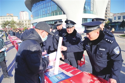 12月4日,长治市“法治集市”在体育公园开市。市司法局、公安局、律师协会、法院等单位联合“摆摊”,通过面对面咨询、互动游戏等形式,为市民送上法律知识“大餐”,让宪法精神在趣味互动中深入人心。图为市公安局民警向市民发放普法宣传资料。