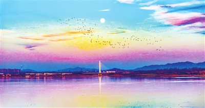 近日,落日余晖中被誉为“太行天池”的漳泽湖水面波光粼粼,与周围建筑的灯光交相辉映,湖面上成群的鸟儿舒展双翼,或低空盘旋、或振翅翱翔,清脆的鸣叫声划破夜色,勾勒出一幅灵动和谐的生态画卷。 郭世虎 摄