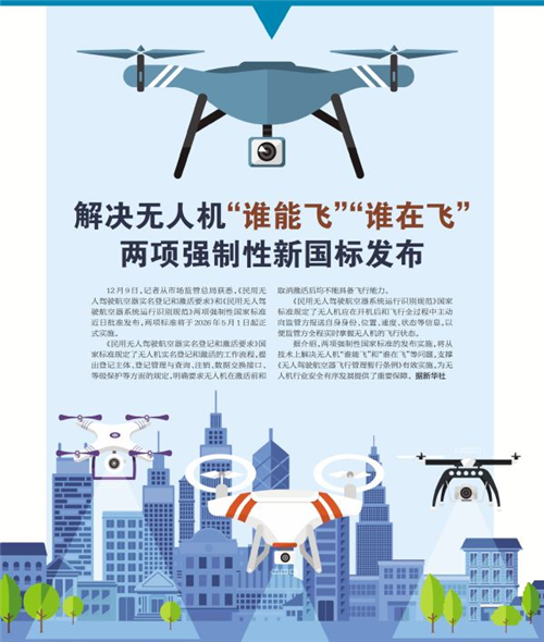 12月9日,记者从市场监管总局获悉,《民用无人驾驶航空器实名登记和激活要求》和《民用无人驾驶航空器系统运行识别规范》两项强制性国家标准近日批准发布,两项标准将于2026年5月1日起正式实施。