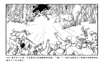 242.鬼子扑了上来,大宝接过父亲装满铁砂的枪,“嘭”,一团火光喷出几十粒细小的铁砂,同时射中了十几个鬼子。