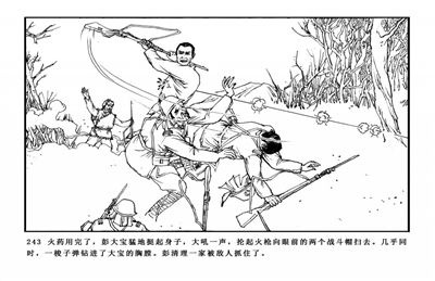 243.火药用完了,彭大宝猛地挺身,大吼一声,抡起火枪向眼前的两个鬼子扫去。几乎同时,一梭子弹射进大宝的胸膛,彭清理一家被敌人抓住了。