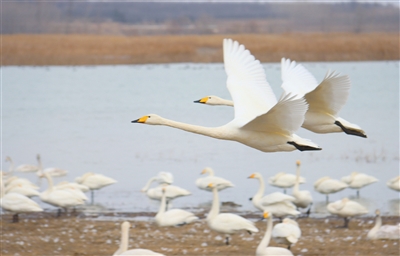 进入冬季,大批白天鹅来到河南省三门峡市黄河湿地栖息越冬。近年来,随着当地不断加强黄河沿岸湿地生态保护工作,白天鹅的数量逐年增加。目前,三门峡黄河岸边40余万亩浅滩湿地已迎来万余只白天鹅。 新华社发 刘肖坤 摄