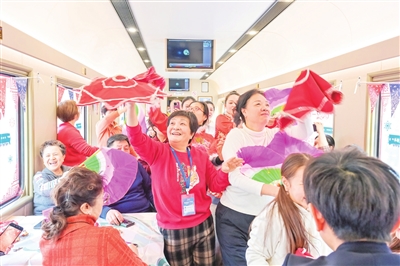 12月28日,在哈尔滨开往亚布力的Y999/998次“悠享龙江·银旅号”旅游列车上,来自江浙等地的200多名游客开启跨年冰雪游之旅。这是黑龙江开行的首趟冰雪环线旅游列车,其行程为期6天,将经过哈尔滨、亚布力、阿里河、漠河等地。图为游客在旅游列车上体验东北民俗。 新华社发 原勇 摄