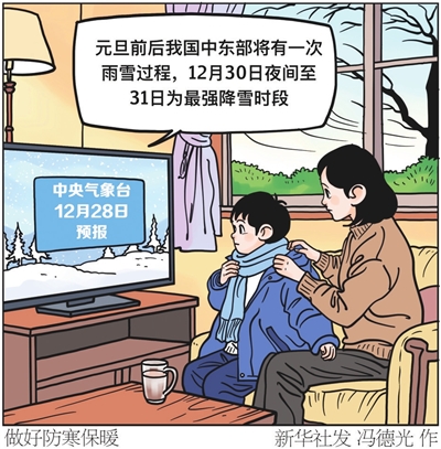 新华社北京12月28日电 中央气象台12月28日预报,元旦前后我国中东部将有一次雨雪过程,12月30日夜间至31日为最强降雪时段。