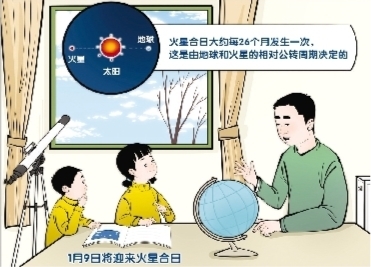 新华社南京1月7日电 (记者王珏玢 邱冰清)1月9日将迎来火星合日。届时,地球和火星分别运行到太阳两侧,三者几乎成一条直线,火星将短暂“失联”。这一阶段火星和地球距离很远,约为3.595亿公里,约合2.403个天文单位。