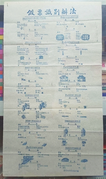 近日,在山西襄垣县一位收藏者手里发现一张“假币识别办法”的珍贵藏品。这张藏品高56厘米,宽32厘米的蓝色印刷图谱,白色麻头纸信封上“虒亭冀南银行兑换所 魏国模同志”的毛笔题字苍劲有力,背面“虒亭商务会”的繁体落款依稀可辨。这便是1939年冀南银行太行区行制发的《假票识别办法》。作为一件藏品揭开了抗战时期晋冀鲁豫根据地一场没有硝烟的货币战争。