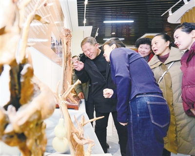 继续向内探寻,潞城铜艺在千锤百炼间彰显金属的坚韧与细腻;潞城甩饼的传统制作工具——斑驳的鏊子、光滑的擀面杖,仿佛能让人嗅到薄脆焦香的美味;神秘的羌文化元素,为展览增添一抹别样的古韵风情;顺潞根雕则依形赋意,化腐朽为神奇,让枯木在匠心独运中焕发新生。