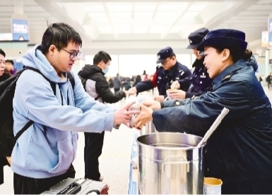 1月25日,在合肥南站候车大厅,工作人员将腊八粥送给旅客。
