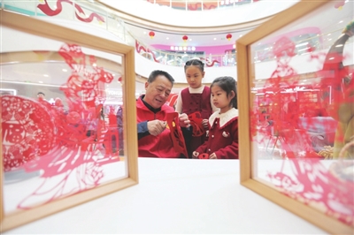 2月4日,恰逢立春节气,各地举办丰富多彩的活动,喜迎新春。当日,剪纸手艺人在甘肃省定西市一商场教小朋友剪纸技艺。