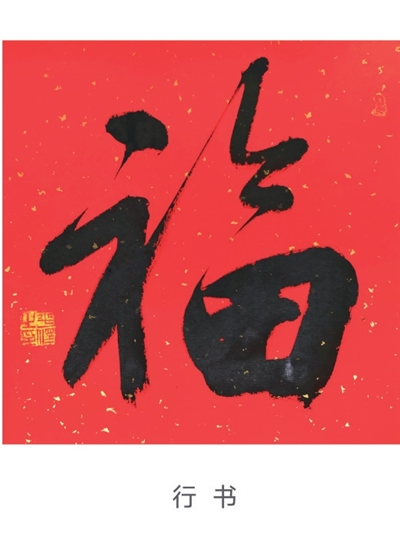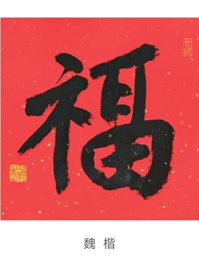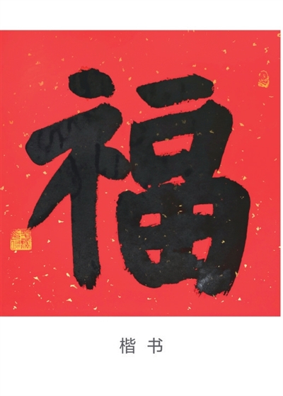 楷书“福”字的“畐”承袭了隶书的形状,只是将“口”和“田”原本分两笔写的上方一横和右侧一竖连在一起写,变成横竖勾。“示”字的变化较大,表现在上面一横变成了一点,并且整体来说,“福”字左边比较窄,更利于书写。