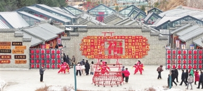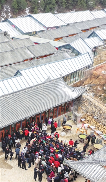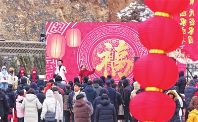 雪道蜿蜒、冰场开阔,游客乘雪圈飞驰、在冰面嬉戏,欢声笑语回荡山谷;民俗展演、特色市集依次排布,非遗技艺、地方美食、文创产品集中亮相,传统年味与现代休闲碰撞交融;太行雪景与古建轮廓相映成趣,航拍视角下,银白色群山与热闹会场形成强烈视觉对比,尽显“太行冬韵、冰雪狂欢”的独特景致。