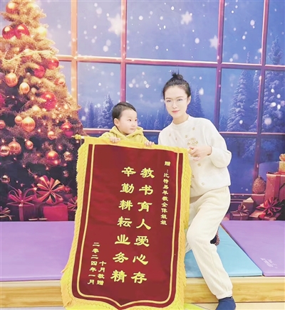 早教中心接收的孩子年龄跨度从3个月到6岁,管理难度不小。面对孩子们的哭闹、撒娇,窦蓉始终保持耐心。两岁半的男孩壮壮曾是令家长头疼的“小难题”,由于父母陪伴较少,壮壮性格内向、不爱说话,同龄孩子已能说出简单完整的句子,他却只能支支吾吾吐出两个字,还常因情绪失控在地上打滚。了解情况后,窦蓉专门为壮壮制定一对一教学计划,先以陪伴安抚情绪,通过运动与益智结合的游戏建立信任,再针对性进行口腔张力训练和语言引导。久而久之,壮壮逐渐变得活泼开朗,不仅愿意主动交流,还能清晰表达自己的想法。家长特意送来锦旗表示感谢。